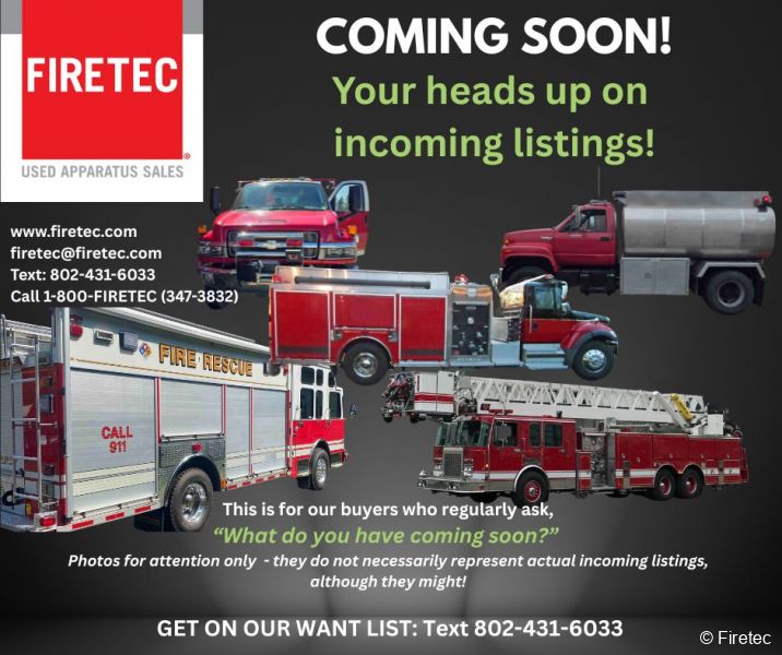 Vehicle specifications are provided to Firetec by the sellers. Firetec makes no claim as to their accuracy and all specifications are subject to inspection and verification. All apparatus sold as-is, where-is.